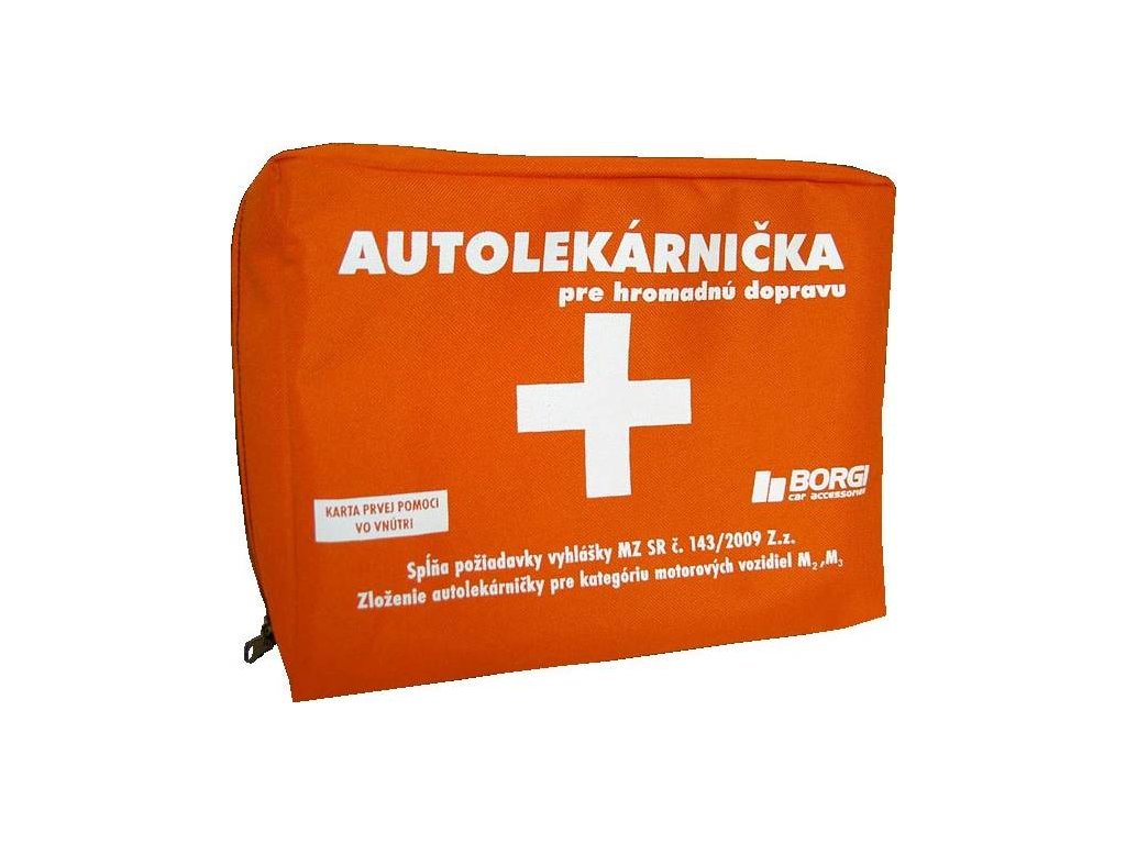 Autolekárnička s výbavou podľa Vyhlášky MZ SR 143/2009 Z.z. S kartou prvej pomoci. Oddelené sekcie. Pre počet osôb na sedenie do 22, kategógia vozidiel M2, M3. Vozidlá s počtom miest na sedenie nad 22 musia mať v povinnej výbave 2 ks lekárničiek pre hromadnú dopravu.