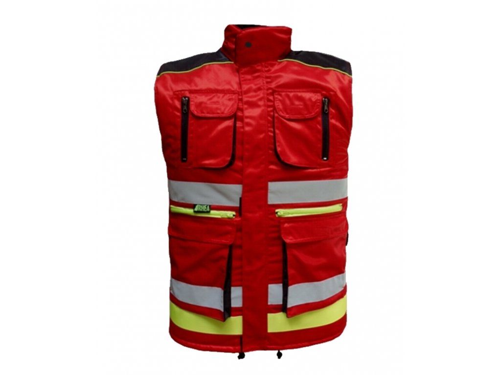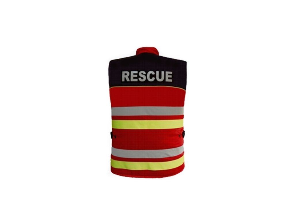 GERED zateplená pracovná vesta s reflexnými pruhmi. Materiál: vode + oleju + nečistote odolná tkanina Polyester/Bavlna + prešívané futro.Reflexné pruhy š.5cm RETROX – strieborný a žltý reflex.Reflexný strieborný nápis HASIČI / RESCUE (prípadne voliteľný nápis za príplatok) na chrbáte.Dvojité sedlo v čiernej farbe s fluožltým lampasom.Zapínanie na zips prekrytý légou + suché zipsy.Golier zapínanie na suchý zips s príklopkou.Dve spodné dvojité vrecká – otvorené z boku a prekryté zhora príklopkou.2 skryté vrecká v páse, 2 hrudné vrecka kombinované.2x vnútroné vrecko s príklopkou na futre.Zápinky v páse pre reguláciu obvodu pásu + šnúra s brzdou na stiahnutie dolnej časti vesty proti podfúknutiu.