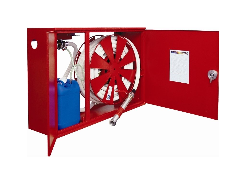 Nástenný hydrant penotvorný s tvarovo stálou hadicou D25 – 30 bm, plné dvierka a ľavé prevedenie je certifikovaný protipožiarny systém určený na vnútorné použitie podľa normy EN 671-1.