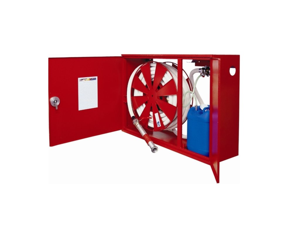 Nástenný hydrant penotvorný s tvarovo stálou hadicou D33 – 30 bm, plné dvierka a ľavé prevedenie je certifikovaný protipožiarny systém určený na vnútorné použitie podľa normy EN 671-1.