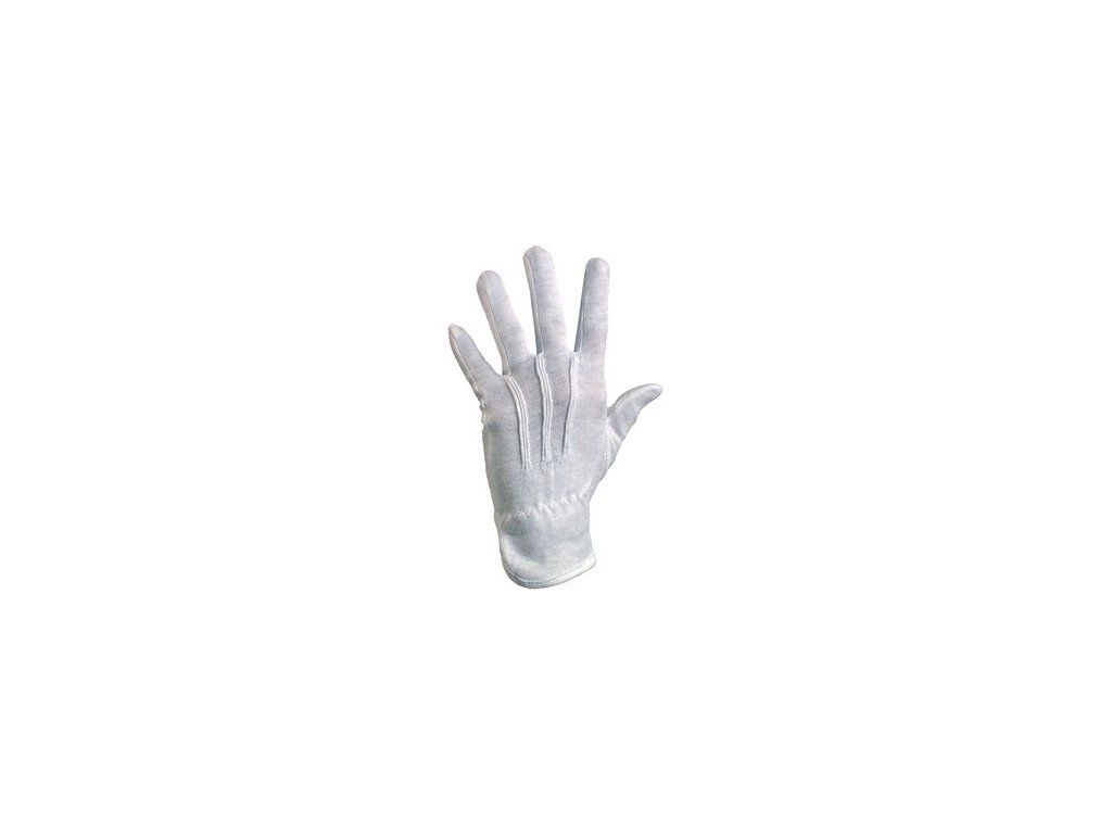 Textilné šité rukavice z bieleného bavlneného úpletu, strih fourchette, dlaň a prsty pokryté drobnými PVC terčíkmi, gumička v zápästí.