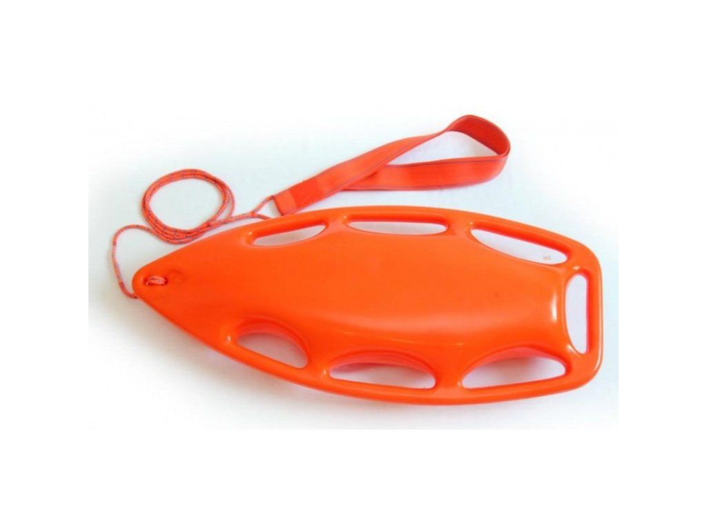 Oranžový plavák z plastickej hmoty s rukoväťami, vybavený záchranným pásom a ťažným lanom.